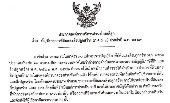 ประกาศบัญชีรายการที่ดินและสิ่งปลูกสร้าง ภ.ด.ส 3 ประจำปี 2569