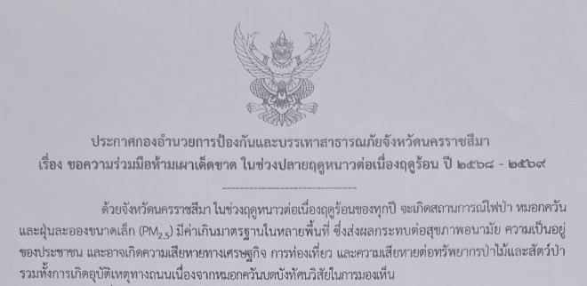 ประกาศกองอำนวยการป้องกันและบรรเทาสาธารณภัยจังหวัดนครราชสีมา ขอความร่วมมือห้ามเผาเด็ดขาด ในช่วงปลายฤดูหนาวต่อเนื่องฤดูร้อน ปี 2568-2569