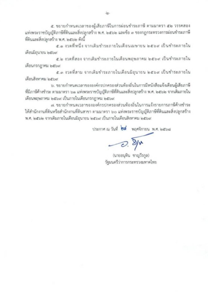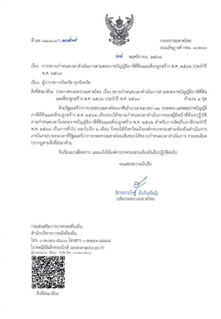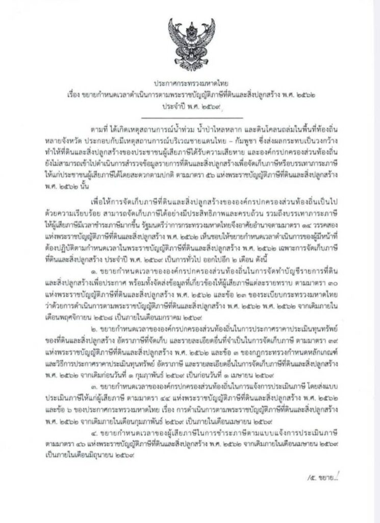 ประกาศขยายเวลาการดำเนินการชำระภาษีที่ดินและสิ่งปลูกสร้าง ประจำปี 2569
