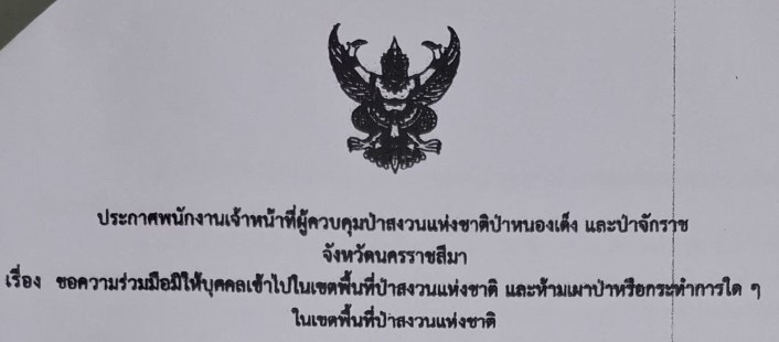 ประกาศพนักงานเจ้าหน้าที่ผู้ควบคุมป่าสงวนแห่งชาติป่าหนองเต็ง และป่าจักราช จังหวัดนครราชสีมา เรื่อง ขอความร่วมมือมิให้บุคคลเข้าไปในเขตพื้นที่ป่าสงวนแห่งชาติ และห้ามเผาป่าหรือกระทำการใดๆในเขตพื้นที่ป่าสงวน